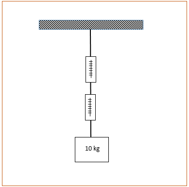 ස්කන්ධය නොසලකා හරිය හැකි දුනු තරාදි දෙකක් එකිනෙකට සම්බන්ධ කොට 10 kg ස්කන්ධයක් එයින් එල්ලා ඇත්තේ රූපයේ පෙන්වා ඇති පරිදිය. මෙම අවස්ථාව සඳහා සත්ය වන්නේ පහත දැක්වෙන කුමන ප්රකාශය ද ?
