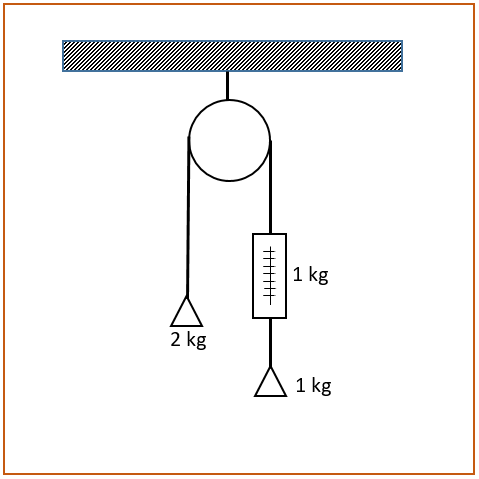 රූපයේ පෙන්වා ඇති පරිදි සුමට කප්පියක් උඩින් යවන සැහැල්ලු තන්තුවක ස්කන්ධය 1 kg වූ දුනු තරාදියක් සහ 1 kg සහ 2 kg වන ස්කන්ධ දෙකක් දරා සිටී.තරාදියේ පාඨාංකය වනුයේ,