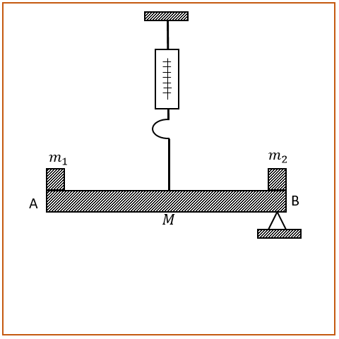 දුනු තරාදියක් මඟින් ස්කන්ධය M වූ ඒකාකාර දණ්ඩක්, එහි මධ්ය ලක්ෂ්යයෙන් එල්ලා ඇත. m1 සහ m2 (m2 > m1) වූ ස්කන්ධ දෙකක් දණ්ඩේ දෙකෙළවර තබා ඇත. රූපයේ පෙනෙන පරිදි B කෙළවරෙහි තබන ලද කුඤ්ඤයක් ආධාරයෙන් දණ්ඩ තිරස් ව තබා ඇත. දුනු තරාදියේ පාඨාංකය වනුයේ,