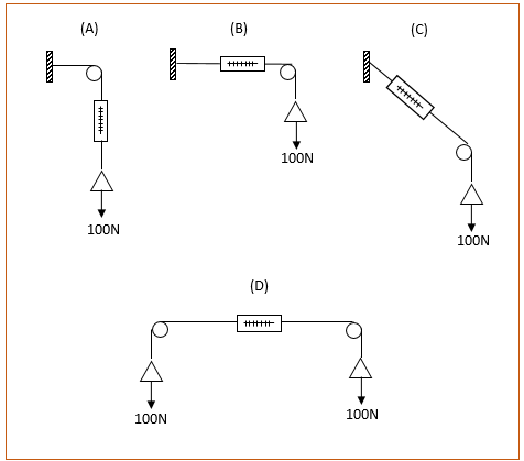 සැහැල්ලු දුනු තරාදියකට සුමට කප්පි භාවිත කර 100 N බරක් යොදා ඇති ආකාර 4 ක් A,B,C සහ D යන රූප සටහන්වලින් පෙන්වා ඇත. අවස්ථා හතරේ දී දුනු තරාදි පරිමාණයේ පාඨාංක විය හැක්කේ,